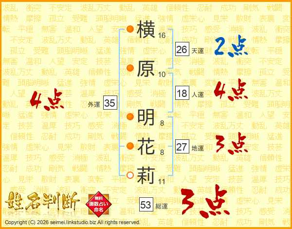 横(16画)原(10画) 明(8画)花(8画)莉(11画)