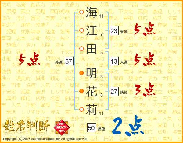 海(11画)江(7画)田(5画) 明(8画)花(8画)莉(11画)