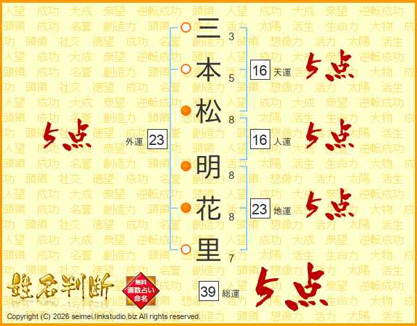三(3画)本(5画)松(8画) 明(8画)花(8画)里(7画)