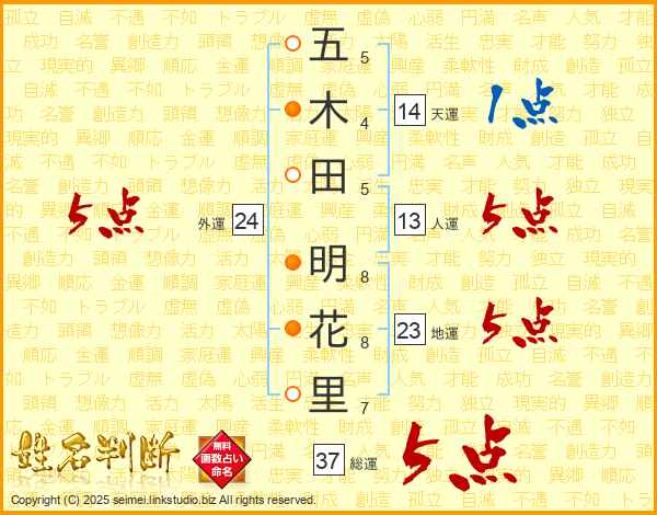 五(5画)木(4画)田(5画) 明(8画)花(8画)里(7画)
