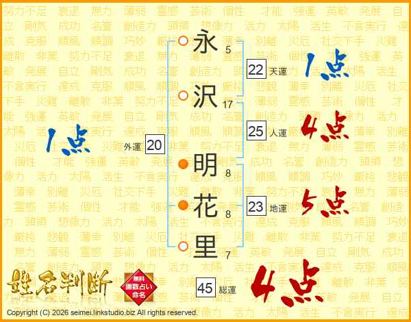 永(5画)沢(17画) 明(8画)花(8画)里(7画)