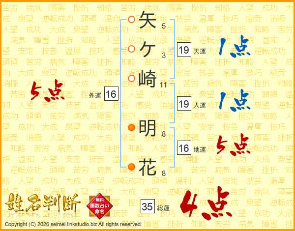 矢(5画)ケ(3画)崎(11画) 明(8画)花(8画)