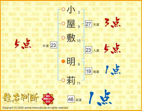 小(3画)屋(9画)敷(15画) 明(8画)莉(11画)