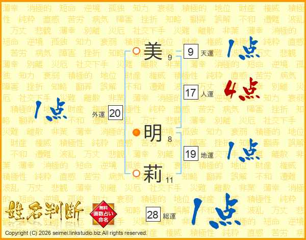 美(9画) 明(8画)莉(11画)