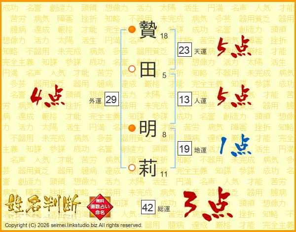 生活面を象徴する運勢です。外部から受ける影響力を表し、結婚運、家庭運や職場、環境への順応性を表します。総運から人運を引いた画数。姓や名が1文字の場合を除く。