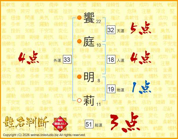 饗(22画)庭(10画) 明(8画)莉(11画)
