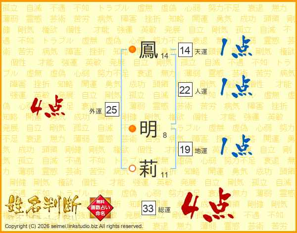 生活面を象徴する運勢です。外部から受ける影響力を表し、結婚運、家庭運や職場、環境への順応性を表します。総運から人運を引いた画数。姓や名が1文字の場合を除く。