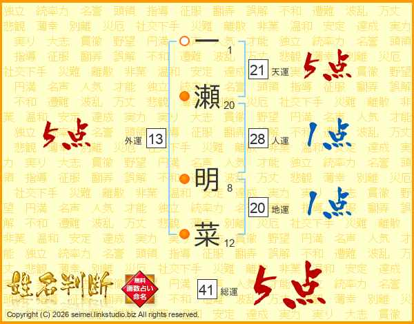 一(1画)瀬(20画) 明(8画)菜(12画)