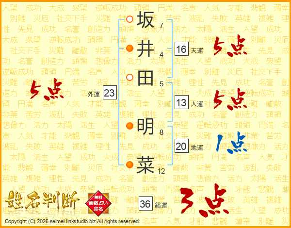坂(7画)井(4画)田(5画) 明(8画)菜(12画)