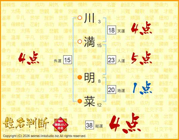 川(3画)満(15画) 明(8画)菜(12画)