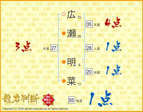 広(15画)瀬(20画) 明(8画)菜(12画)