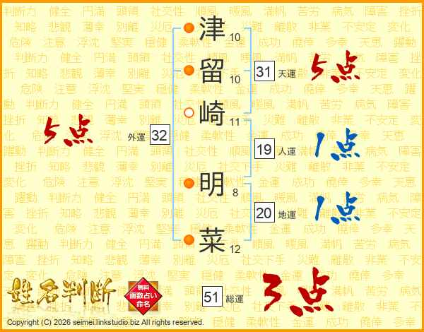 津留崎明菜さんの総運は51画の3点!