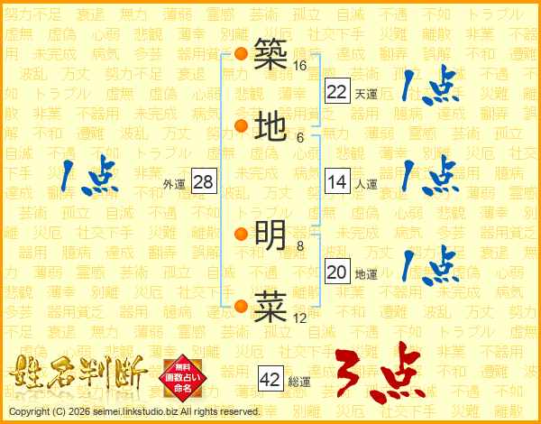 築(16画)地(6画) 明(8画)菜(12画)