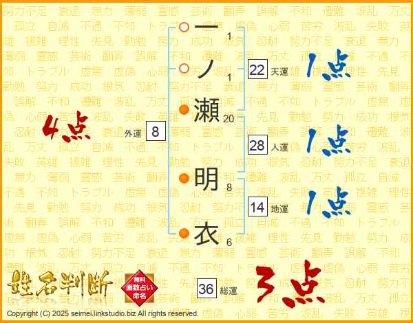 生活面を象徴する運勢です。外部から受ける影響力を表し、結婚運、家庭運や職場、環境への順応性を表します。総運から人運を引いた画数。姓や名が1文字の場合を除く。