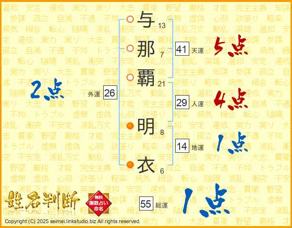 与(13画)那(7画)覇(21画) 明(8画)衣(6画)