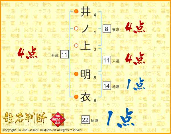 井(4画)ノ(1画)上(3画) 明(8画)衣(6画)