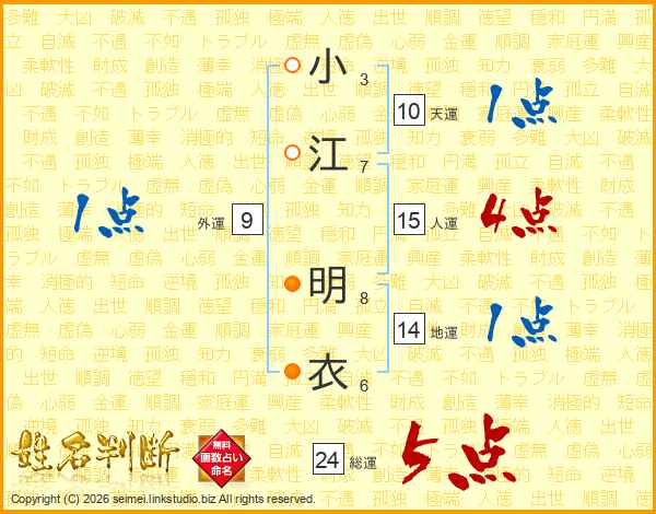 生活面を象徴する運勢です。外部から受ける影響力を表し、結婚運、家庭運や職場、環境への順応性を表します。総運から人運を引いた画数。姓や名が1文字の場合を除く。