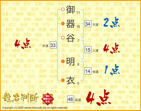 御(11画)器(16画)谷(7画) 明(8画)衣(6画)