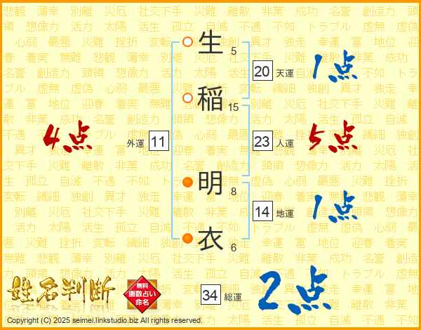 生(5画)稲(15画) 明(8画)衣(6画)