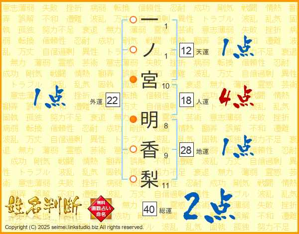 一(1画)ノ(1画)宮(10画) 明(8画)香(9画)梨(11画)