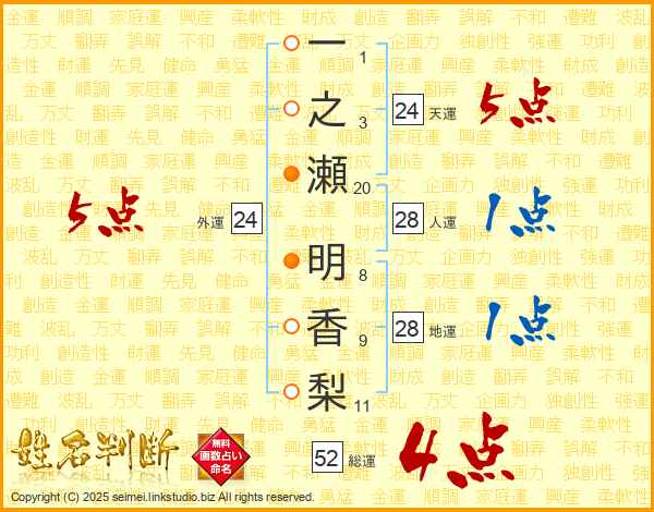 一(1画)之(3画)瀬(20画) 明(8画)香(9画)梨(11画)