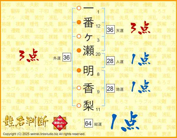 一番ヶ瀬明香梨さんの総運は64画の1点!