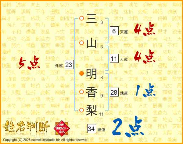 三(3画)山(3画) 明(8画)香(9画)梨(11画)