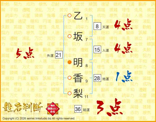 乙(1画)坂(7画) 明(8画)香(9画)梨(11画)