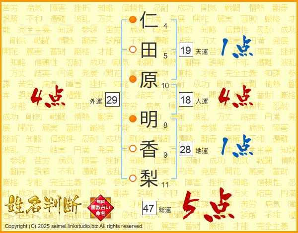 仁(4画)田(5画)原(10画) 明(8画)香(9画)梨(11画)