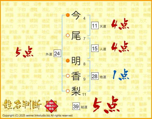 今(4画)尾(7画) 明(8画)香(9画)梨(11画)
