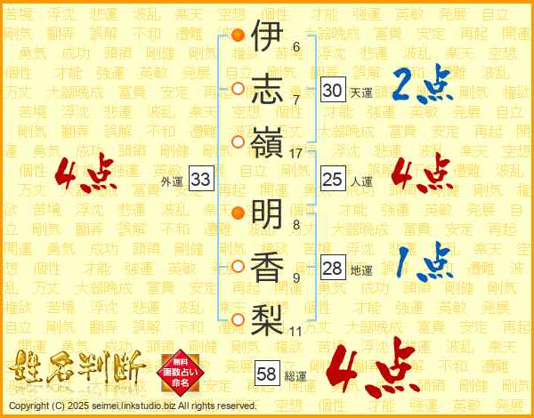 伊(6画)志(7画)嶺(17画) 明(8画)香(9画)梨(11画)
