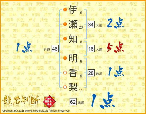伊(6画)瀬(20画)知(8画) 明(8画)香(9画)梨(11画)