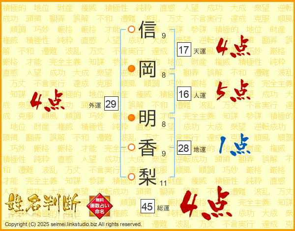信(9画)岡(8画) 明(8画)香(9画)梨(11画)