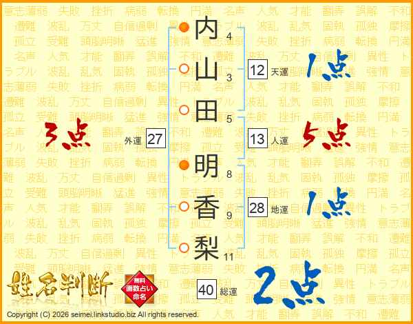 内(4画)山(3画)田(5画) 明(8画)香(9画)梨(11画)