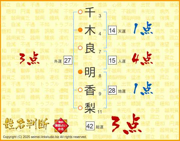 千(3画)木(4画)良(7画) 明(8画)香(9画)梨(11画)