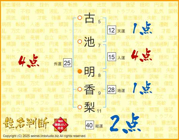 古(5画)池(7画) 明(8画)香(9画)梨(11画)