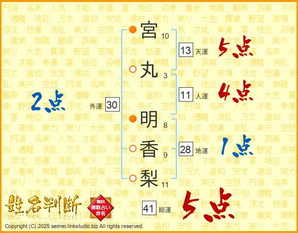 宮(10画)丸(3画) 明(8画)香(9画)梨(11画)
