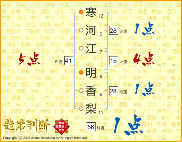 寒(12画)河(9画)江(7画) 明(8画)香(9画)梨(11画)
