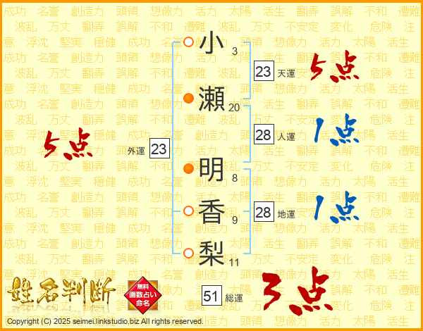 小(3画)瀬(20画) 明(8画)香(9画)梨(11画)