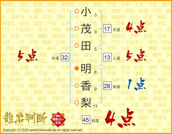 小(3画)茂(9画)田(5画) 明(8画)香(9画)梨(11画)