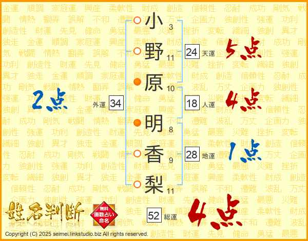 小(3画)野(11画)原(10画) 明(8画)香(9画)梨(11画)