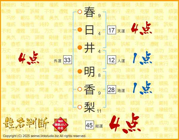 春(9画)日(4画)井(4画) 明(8画)香(9画)梨(11画)