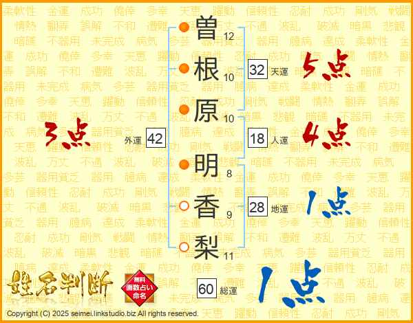 曽(12画)根(10画)原(10画) 明(8画)香(9画)梨(11画)