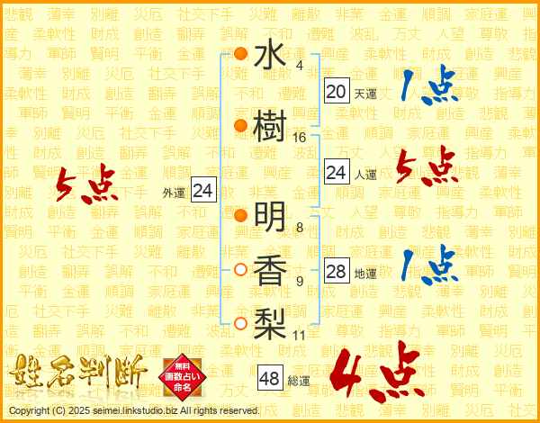 水(4画)樹(16画) 明(8画)香(9画)梨(11画)