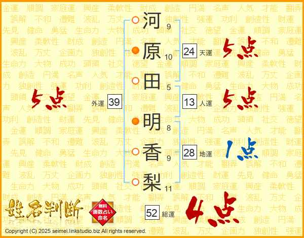 河(9画)原(10画)田(5画) 明(8画)香(9画)梨(11画)