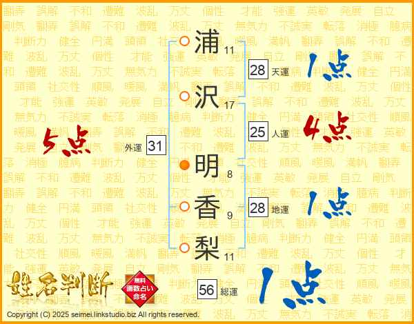 浦(11画)沢(17画) 明(8画)香(9画)梨(11画)