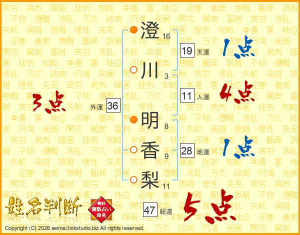 澄(16画)川(3画) 明(8画)香(9画)梨(11画)