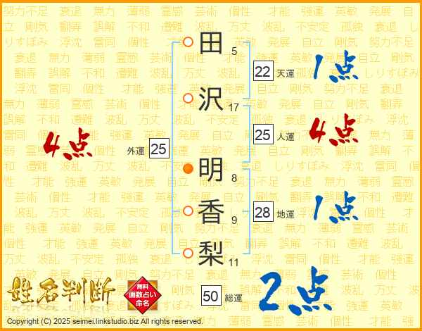 田(5画)沢(17画) 明(8画)香(9画)梨(11画)