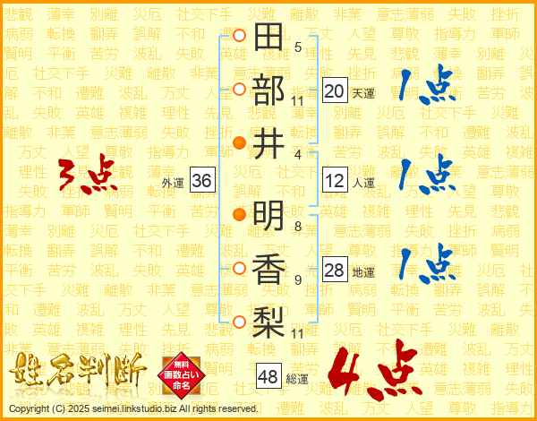 田(5画)部(11画)井(4画) 明(8画)香(9画)梨(11画)