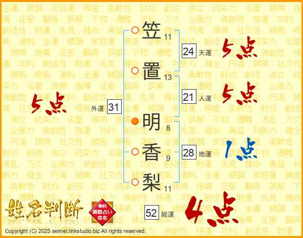 笠(11画)置(13画) 明(8画)香(9画)梨(11画)